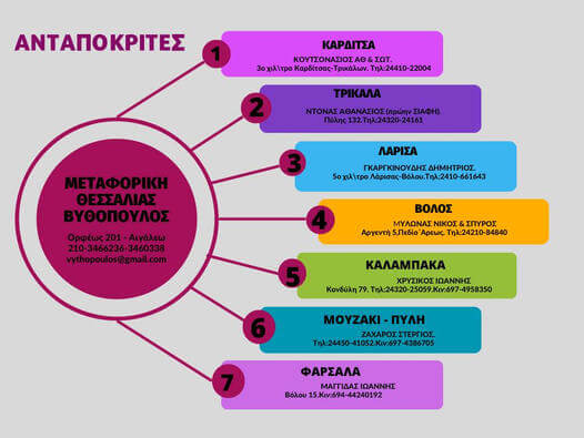 H μεταφορική εταιρία “ΒΥΘΟΠΟΥΛΟΥ” με καθημερινές αποστολές και μεταφορές σε όλη την Θεσσαλία Τρίκαλα Καρδίτσα Λάρισα Βόλο με άμεση παράδοση.Ωράριο Λειτουργίας