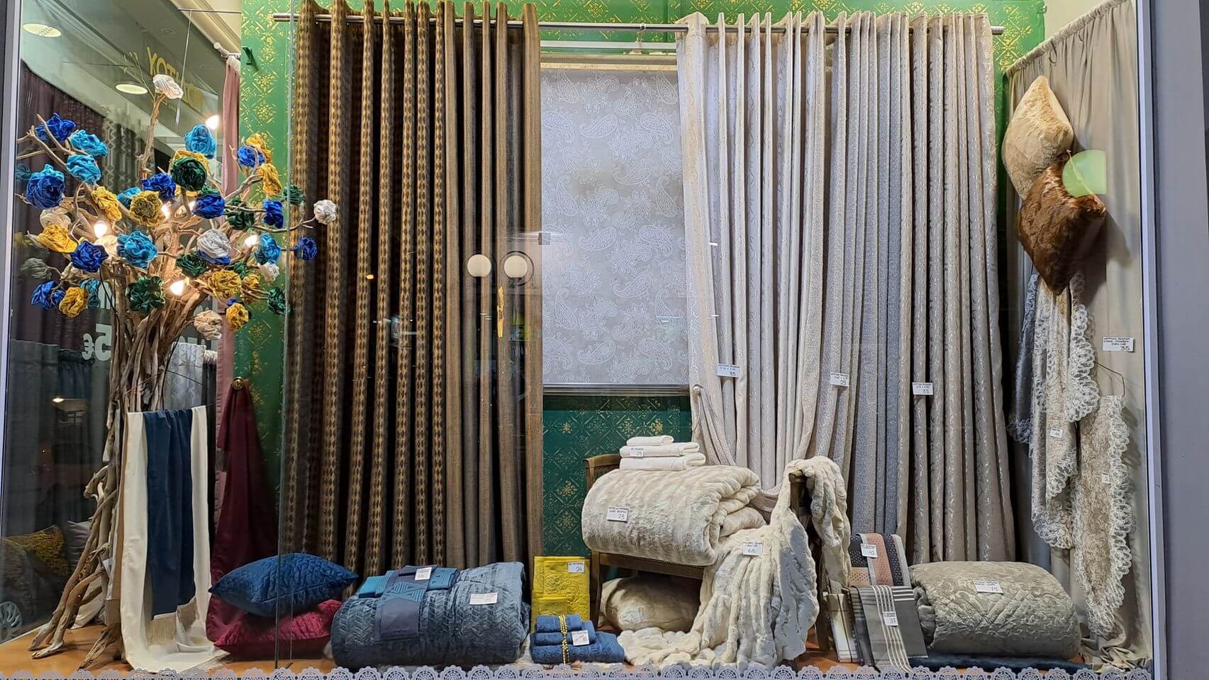 Λιανικό εμπόριο κουρτινών (συμπεριλαμβάνονται και οι πτυχωτές) και εσωτερικών στοριών, γύρων (βολάν) κουρτινών ή κρεβατιών.